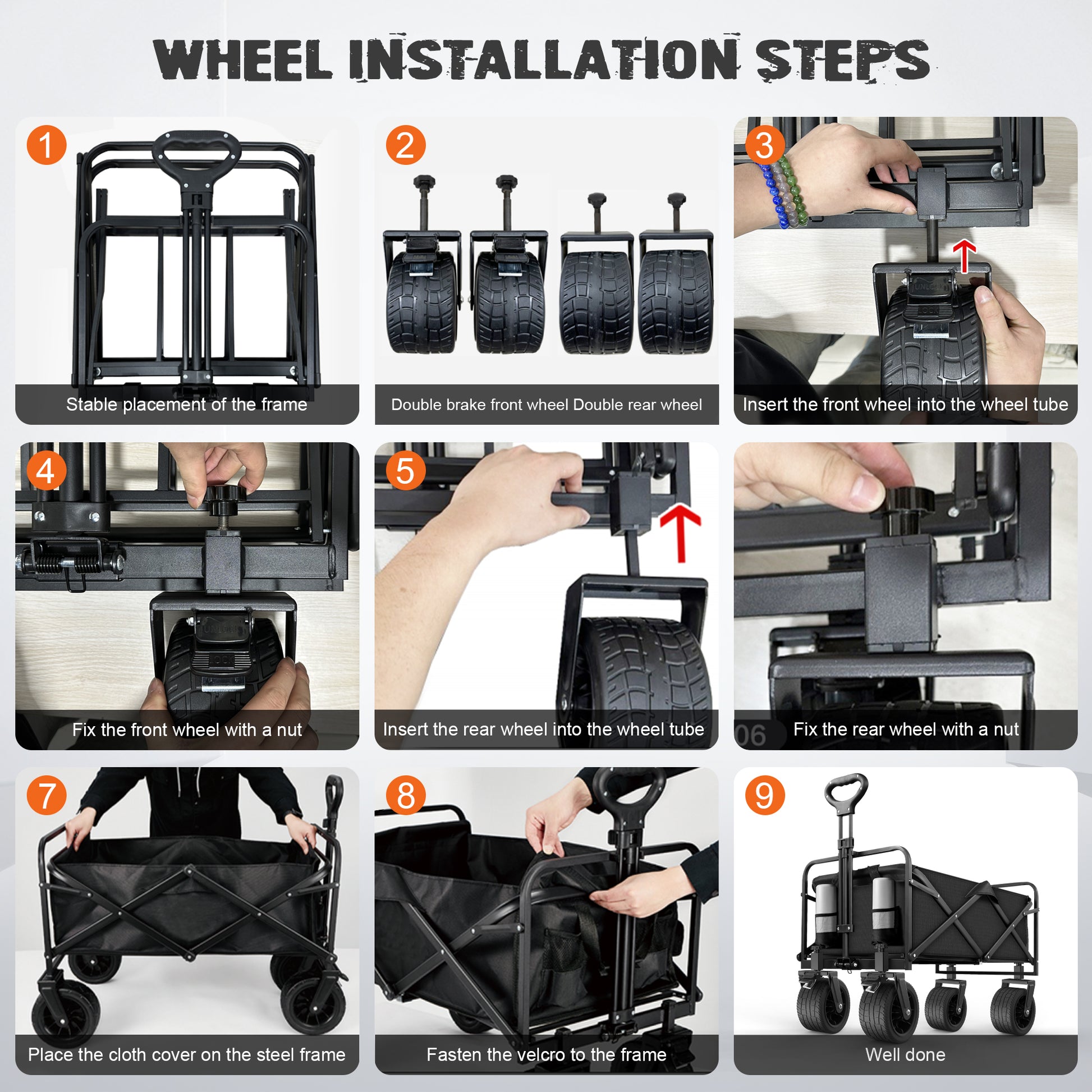 Foldable Garden Wagon is equipped with four thick super fat terrain wheels, two of which can rotate 360 degrees. Easy to roll, no harsh sound or noise. All terrain collapsible wagon can be pulled over a variety of surfaces, including sand; No matter which direction you want to go, you can move easily. Collapsible wagon makes your life easier, so back problems are avoided and physical strain is avoided.