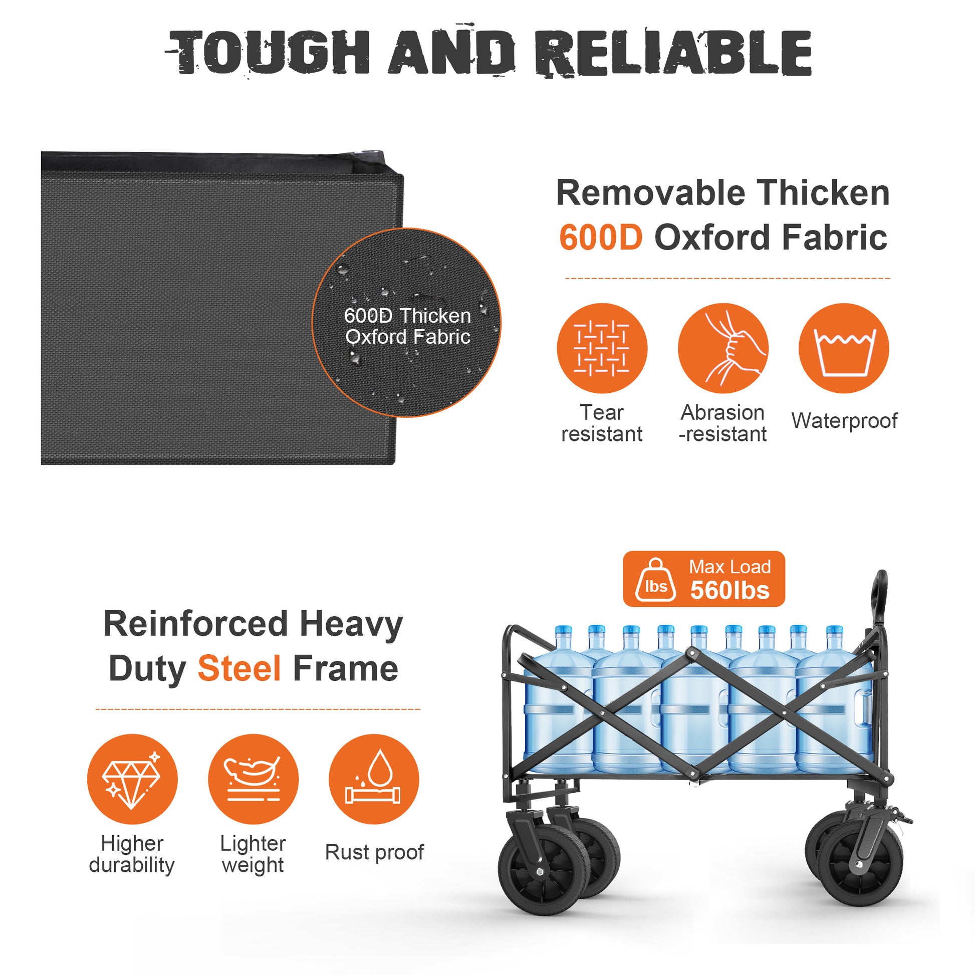 Foldable wagon is made of durable 600 Denier fabric. It allows you to easily carry 560 pounds of gear. Grocery cart heavy-duty frame allows you to easily carry 560 pounds of gear. Ideal for collapsible wagons carts heavy duty foldable for sporting events, concerts,trips to the park, beach or around the house.