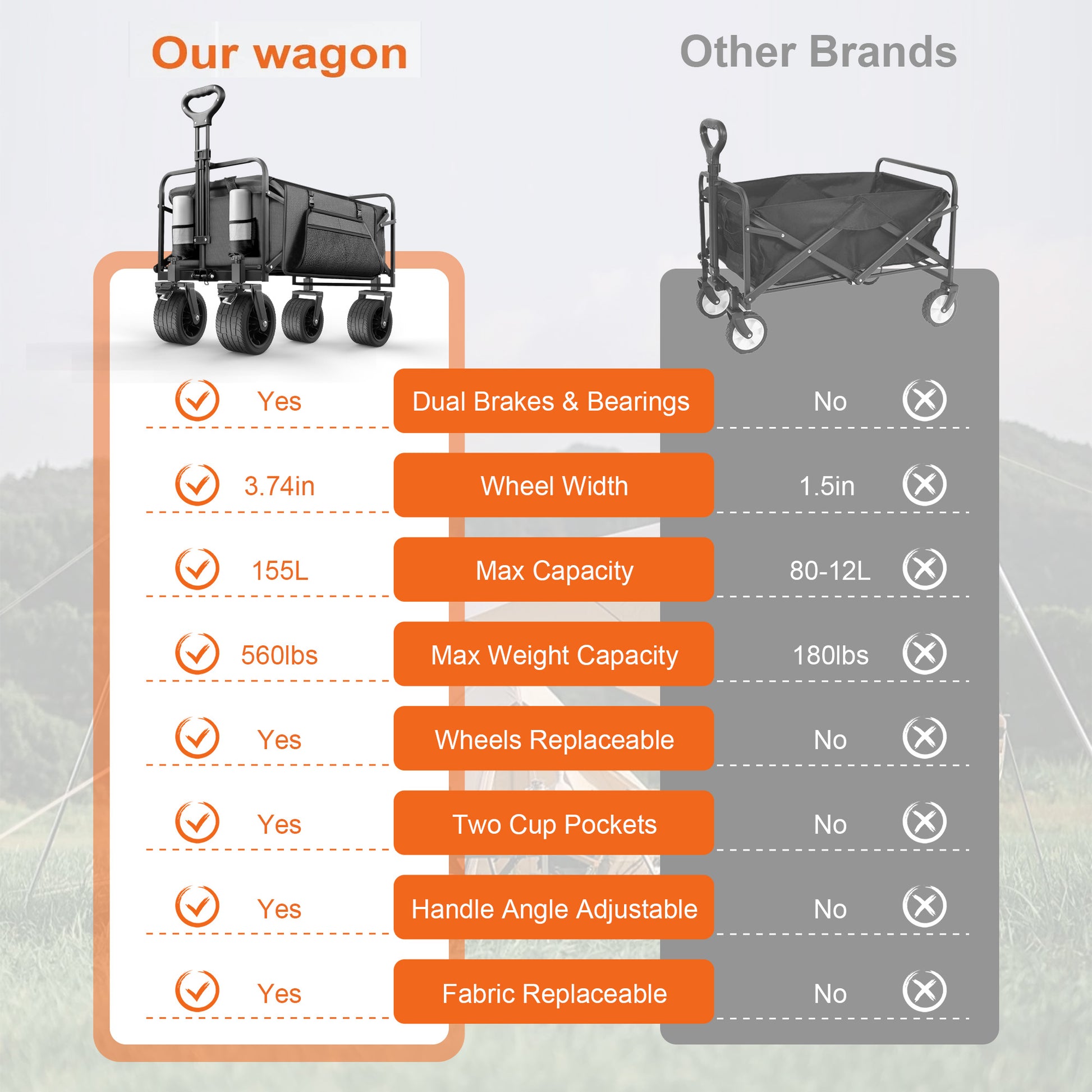 This garden cart has a large capacity of 560 lbs and can hold up to 150L of items. No more backaches from carrying too much stuff with our durable collapsible wagon! Foldable Beach wagon have a surprisingly large volume and are indispensable,for example,loading groceries or going to a campground, laundry or supermarket. Holds up to 30 percent more room than the regular wagon.