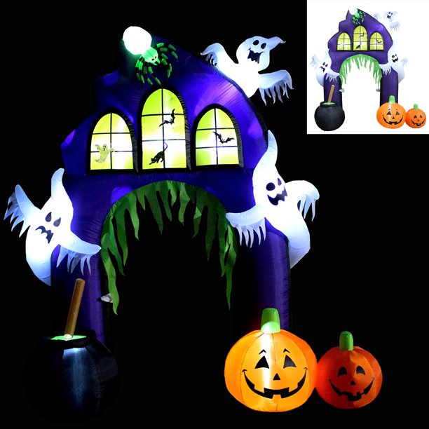 Halloween Inflatable Archway Blowup with Lights. Ideal for both indoor and outdoor use, you can set them up at living room, kitchen, by the pool, front yard, or even porch. With self-inflating design, this Inflatable will be presented in front of your family or love ones in seconds. With the lights, it is the perfect decoration at your front door or backyard at night, it is perfect for Halloween,scary facial expressions create a scary atmosphere for you.