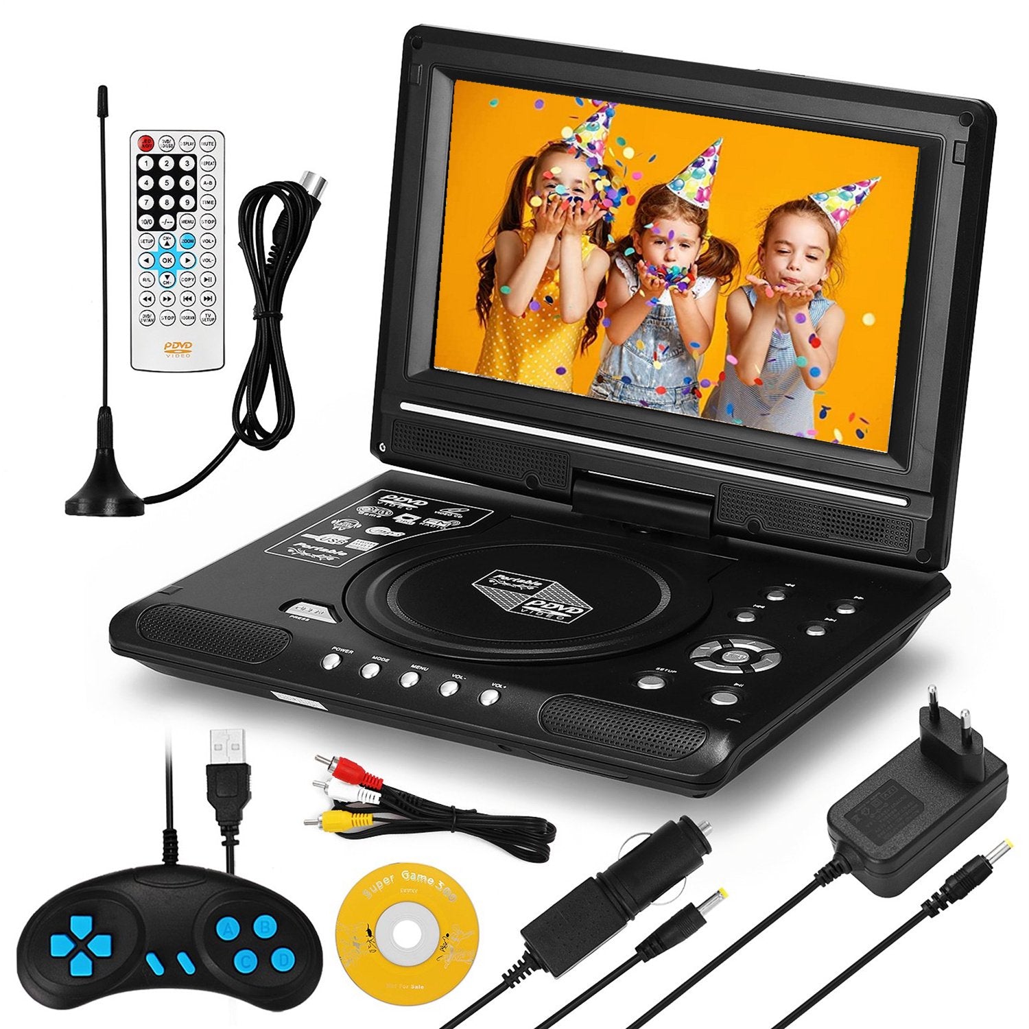 Our portable DVD player is a high definition and high-quality broadcast equipment. It is a multi-functional combination of DVD player, TV player, FM radio receiver, memory card reading, playing games, and so on. Equipped with rechargeable lithium battery for long working , and this Portable DVD P layer fully suitable for car, home, office, vehicle and other occasions.